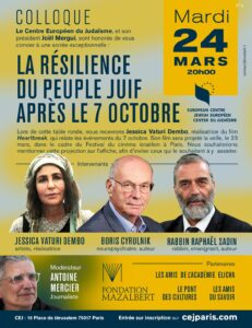 Mardi 24 mars 2026 à 20h00 – Colloque avec Jessica Vaturi Dembo, Boris Cyrulnik, Rav Raphael Sadin. Soirée modérée par Antoine Mercier.
