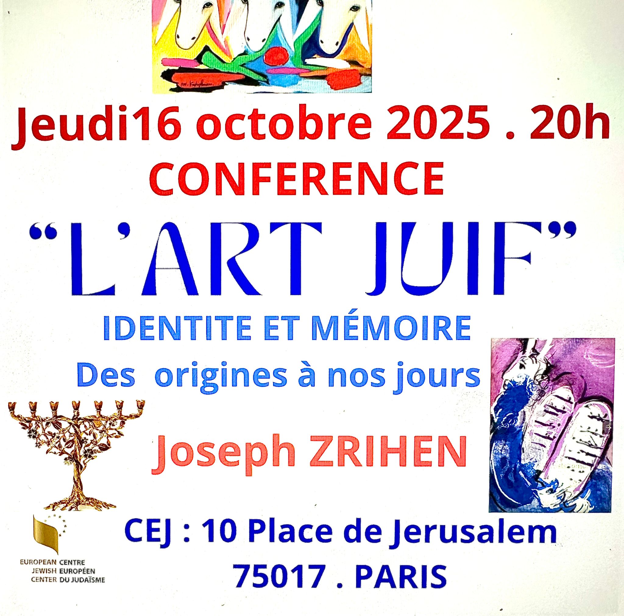 DATE Jeudi 16 octobre 2025 à 20h00 LIEU Le Centre Européen Du Judaïsme Place de Jerusalem 75017 Paris TARIF Entrée libre Réservation obligatoire Tefila et Hallel musicale 🕎 L’ART JUIF : Identité et mémoire Des origines à nos jours Conférence de Joseph Zrihen RÉSERVATION
