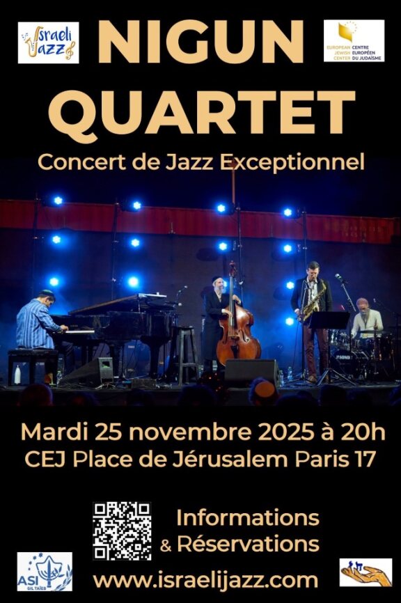Composé de musiciens talentueux, le Quatuor Nigun interprète des mélodies hassidiques enrichies par la musicalité du jazz. Le nigun, chant de la tradition juive européenne, se prête naturellement à de nombreuses improvisations et trouve ainsi un écho parfait dans le langage du jazz. Certains de ces airs prennent la forme de lamentations, tandis que d’autres expriment la joie ou la victoire. Les musiciens du quatuor, véritables virtuoses, se sont produits sur les scènes et festivals du monde entier, recevant partout un accueil enthousiaste à la sortie de chacun de leurs albums. Ces quatre jazzmen nous entraînent dans une expérience musicale émouvante, subtile et complète. Un concert exceptionnel à ne pas manquer !